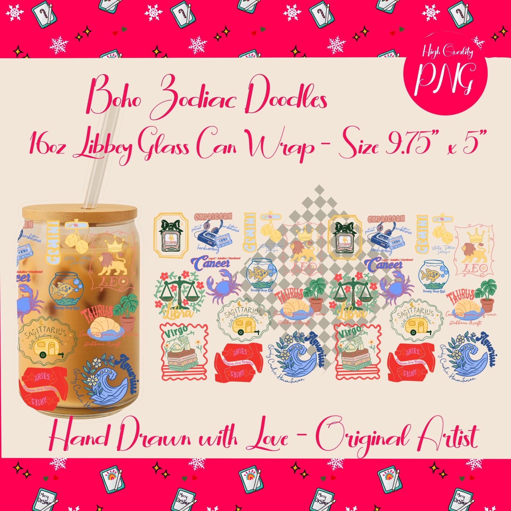 This boho zodiac cup wrap features all 12 signs illustrated in MoeJoe’s signature playful doodle style — warm, earthy palettes, retro charm, and a little cosmic personality in every detail.