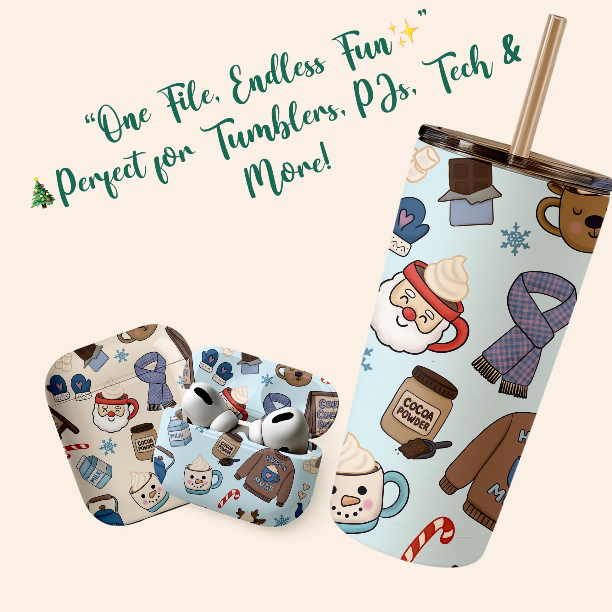 Warm up your holiday designs with this adorable Cozy Christmas Cocoa seamless pattern! Featuring hand-drawn cartoon doodles of Santa mugs, reindeer cocoa, candy canes, whipped cream, snowflakes, mittens, cocoa powder jars, and more – this festive digital download is perfect for sublimation projects, wrapping paper, holiday apparel, printable planner stickers, and cozy winter crafting.