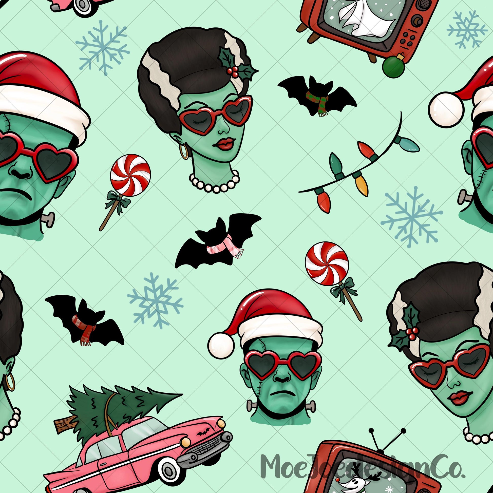 Christmas Frankenstein & Bride Seamless Pattern | Retro Rockabilly (Digital Download)