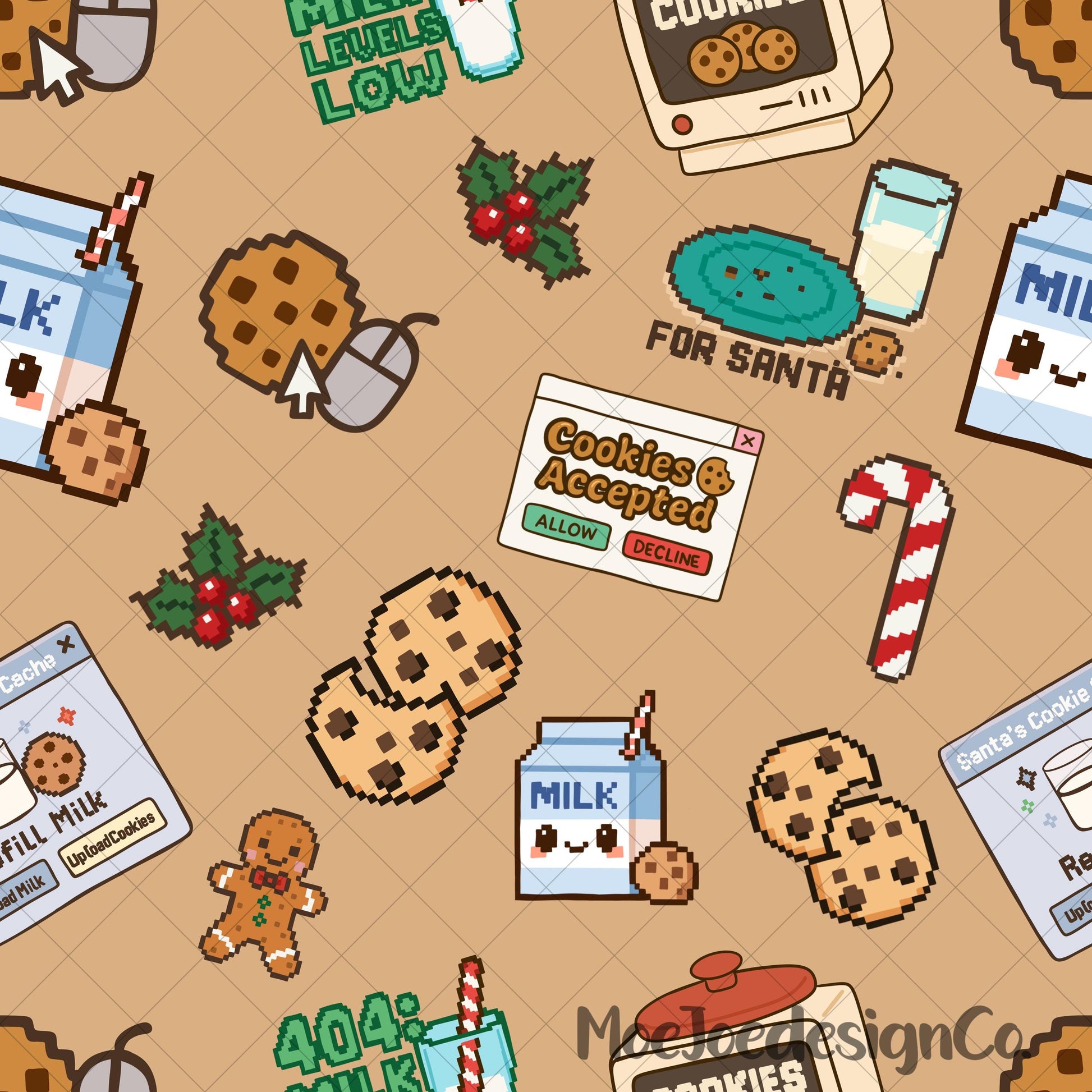 This cozy, pixel-perfect design features milk cartons, cookies, candy canes, gingerbread men, and playful pop-ups like “Cookies Accepted” and “404: Milk Levels Low.” Perfect for creating holiday wraps, PJs, tech sleeves, sublimation prints, or digital projects.