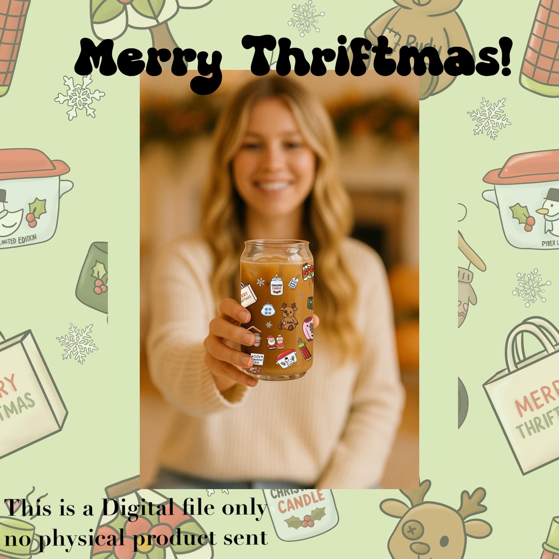 Deck the (thrifted) halls with this super cute, hand-drawn Christmas Thrift Store pattern! Inspired by the thrill of the thrift and all things gently loved, this seamless digital paper is packed with vintage finds: cozy sweaters, kitschy mugs, sassy ornaments, and all the quirky treasures you’d score at your favorite holiday thrift shop. Perfect for tumblers, tees, housewares, planners, and more!
