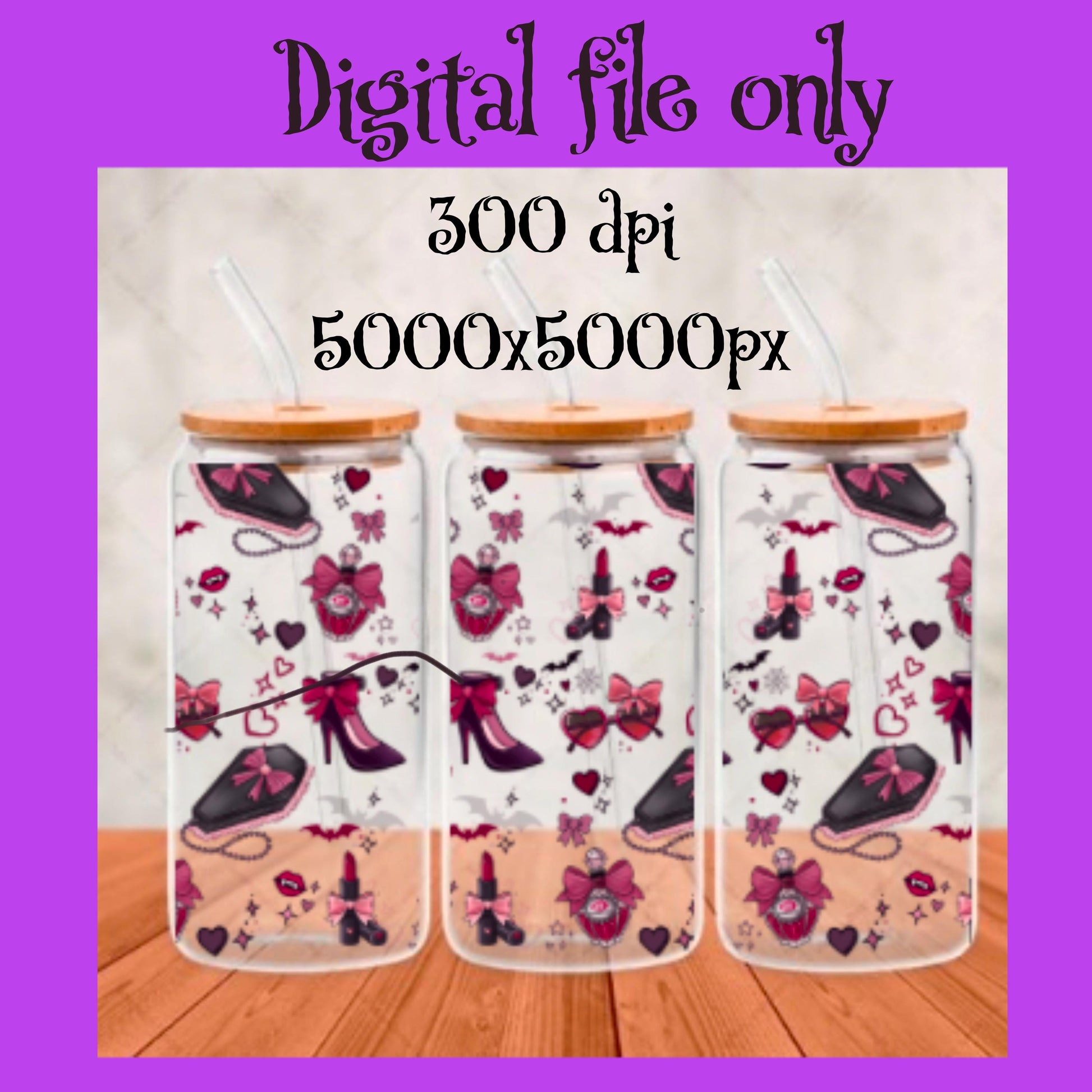 Level up your glass can game with this “Vampy Girl Accessories” wrap! Designed for 16oz Libbey glass cans, this digital PNG download is perfect for fans of coquette, goth girl, and vampire chic aesthetics. With hand-drawn details like heart sunglasses, vampy lipstick, coffin purses, and glam high heels, this wrap brings a unique, playful twist to spooky season and beyond.