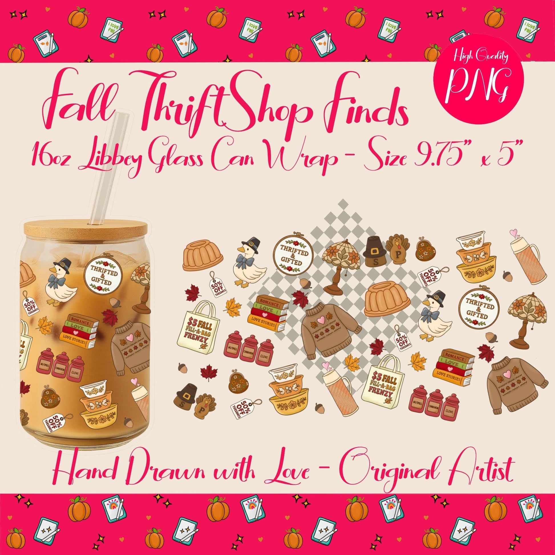 Wrap your favorite glass in cozy autumn vibes! This Fall ThriftShop Finds sublimation wrap fits a standard 16oz Libbey can glass and features hand-drawn vintage elements like a pilgrim goose, Pyrex bowls, turkey shakers, bundt cake, and nostalgic thrift finds. Perfect for Thanksgiving, fall markets, or gifting season!