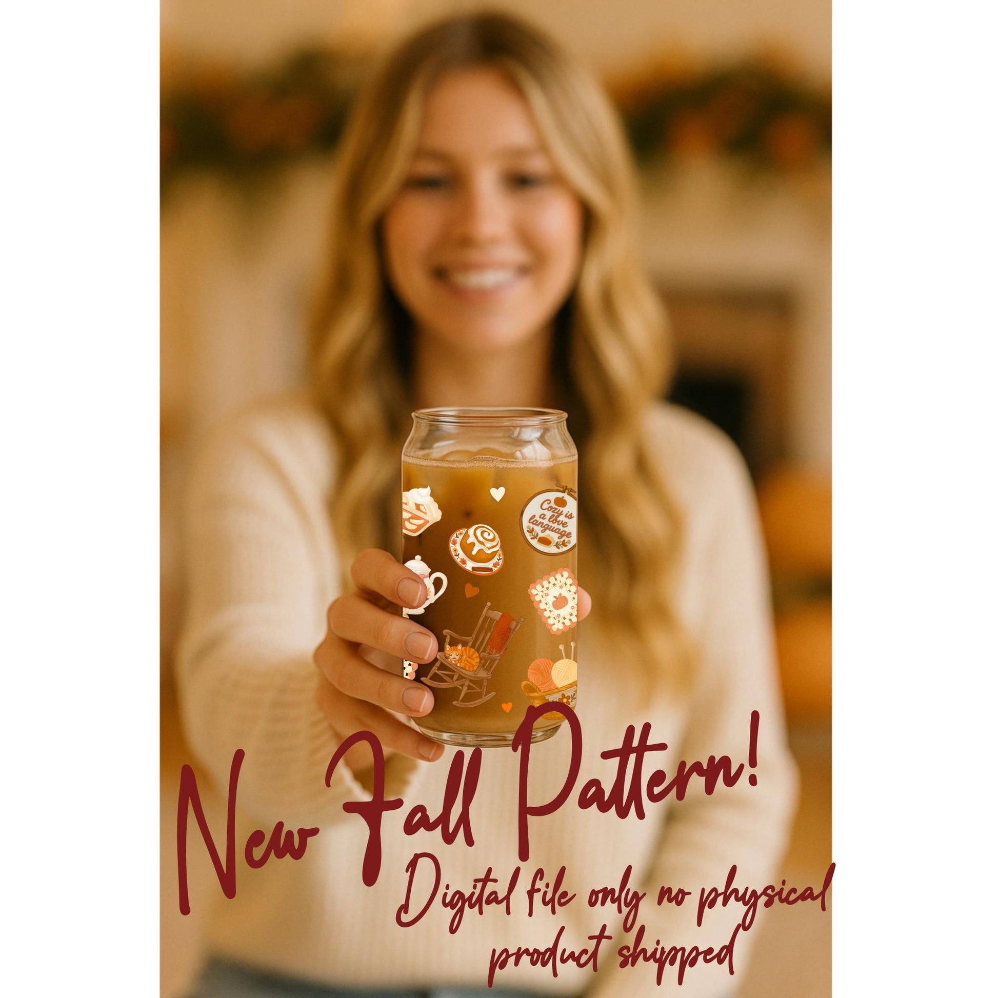 Grannycore Fall Vibes | 16oz Libbey Glass Can Wrap PNG | Cozy Autumn Cat & Tea Pattern