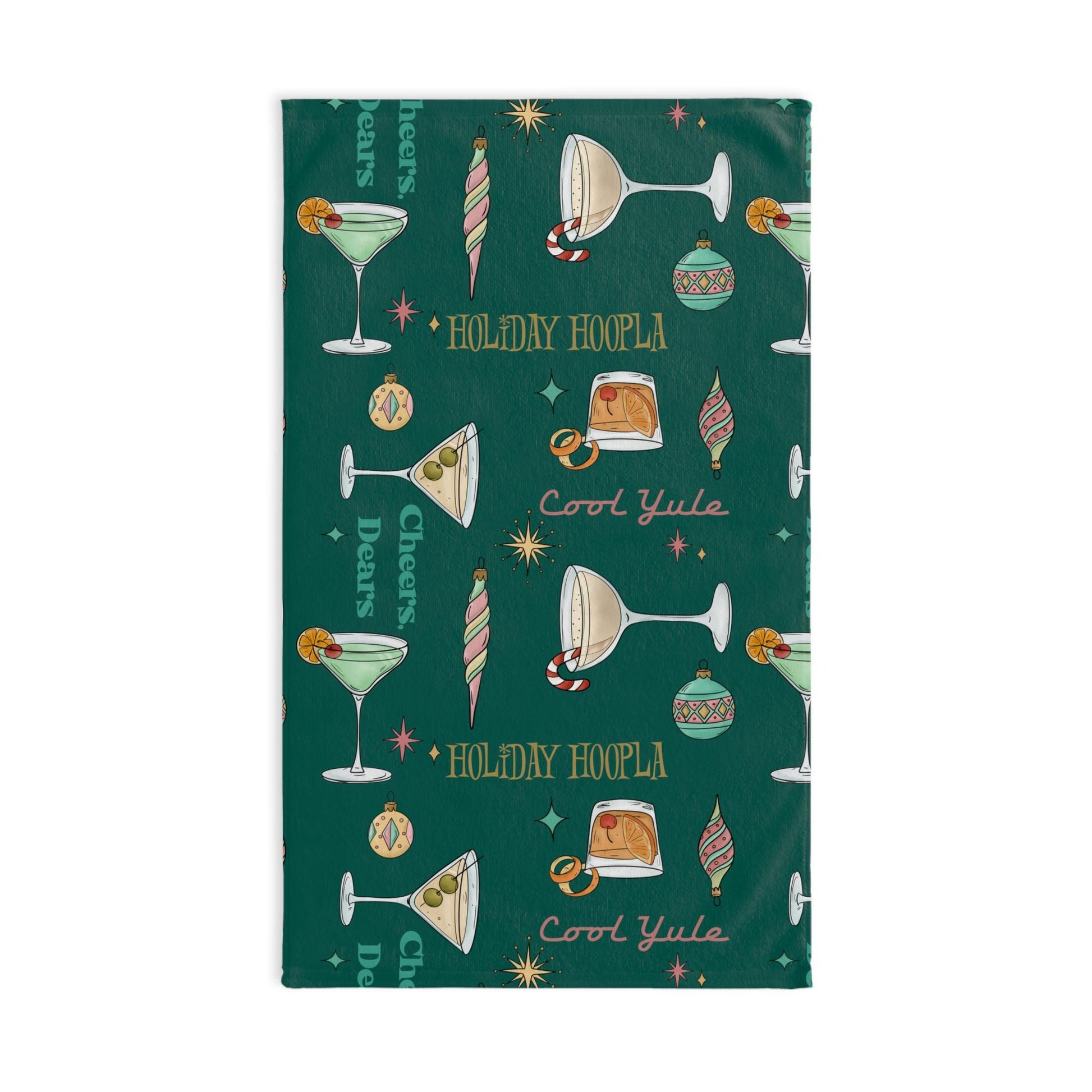 A festive, cocktail-themed hand towel that brings vintage holiday cheer right to the kitchen or bar cart. Lush evergreen fabric is printed on one side with retro martinis, old-fashioned tumblers, candy-cane swizzle sticks, ornaments and hand-lettered phrases like “Holiday Hoopla” and “Cheers, Dears.” The cloth feels soft and lightweight to the touch, so it dries hands quickly without feeling scratchy. Tuck it by the sink, drape it over a towel bar, or lay it near your seasonal beverage station to add a playful, mid-century holiday vibe to gatherings. The bright, crisp print keeps its color and personality wash after wash, so the towel keeps looking celebratory through December toasts and cozy kitchen moments.