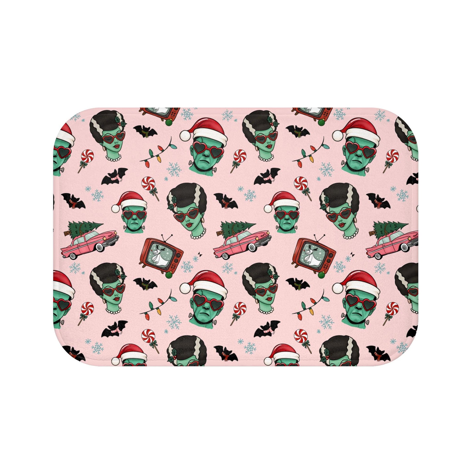 Kitsch Christmas Monsters Bath Mat | Holiday Frankenstein & Bride Pattern