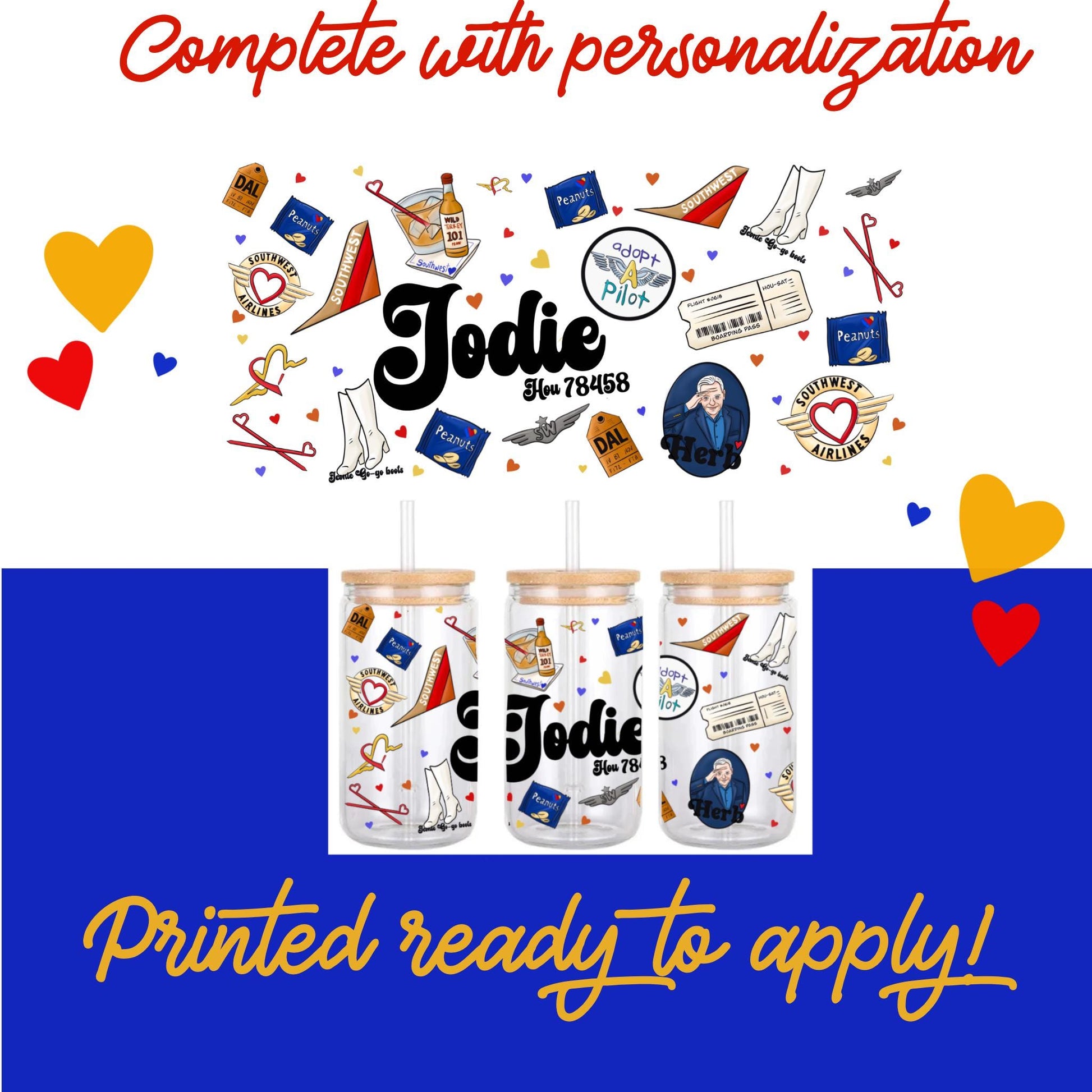 Celebrate my 20 years of flying, friendship, and LUV with this UV DTF glass can wrap sticker! Featuring adorable aviation icons—go-go boots, peanuts, DAL tags, heart stir sticks, and a salute from Herb—this waterproof wrap adds coquette flair to any 16oz Libbey can. Full instructions for application suggestion card will be included. Hand wash only. No microwave or dishwasher.