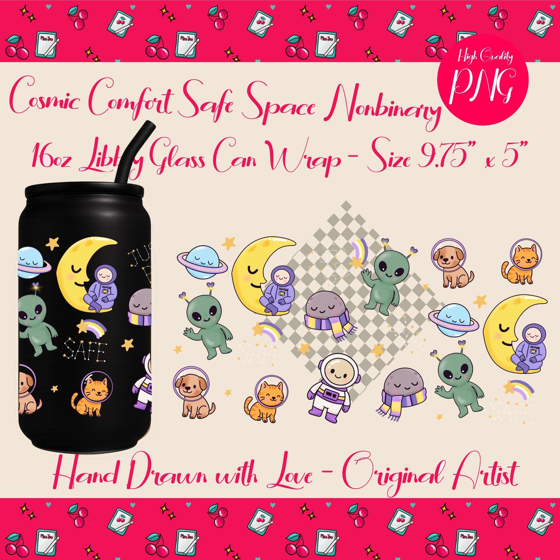 Bring cosmic comfort to your favorite cup with this hand-drawn nonbinary safe space glass can wrap! Perfect for 16oz Libbey glass cans (size 9.75” x 5”), this whimsical kawaii design features: