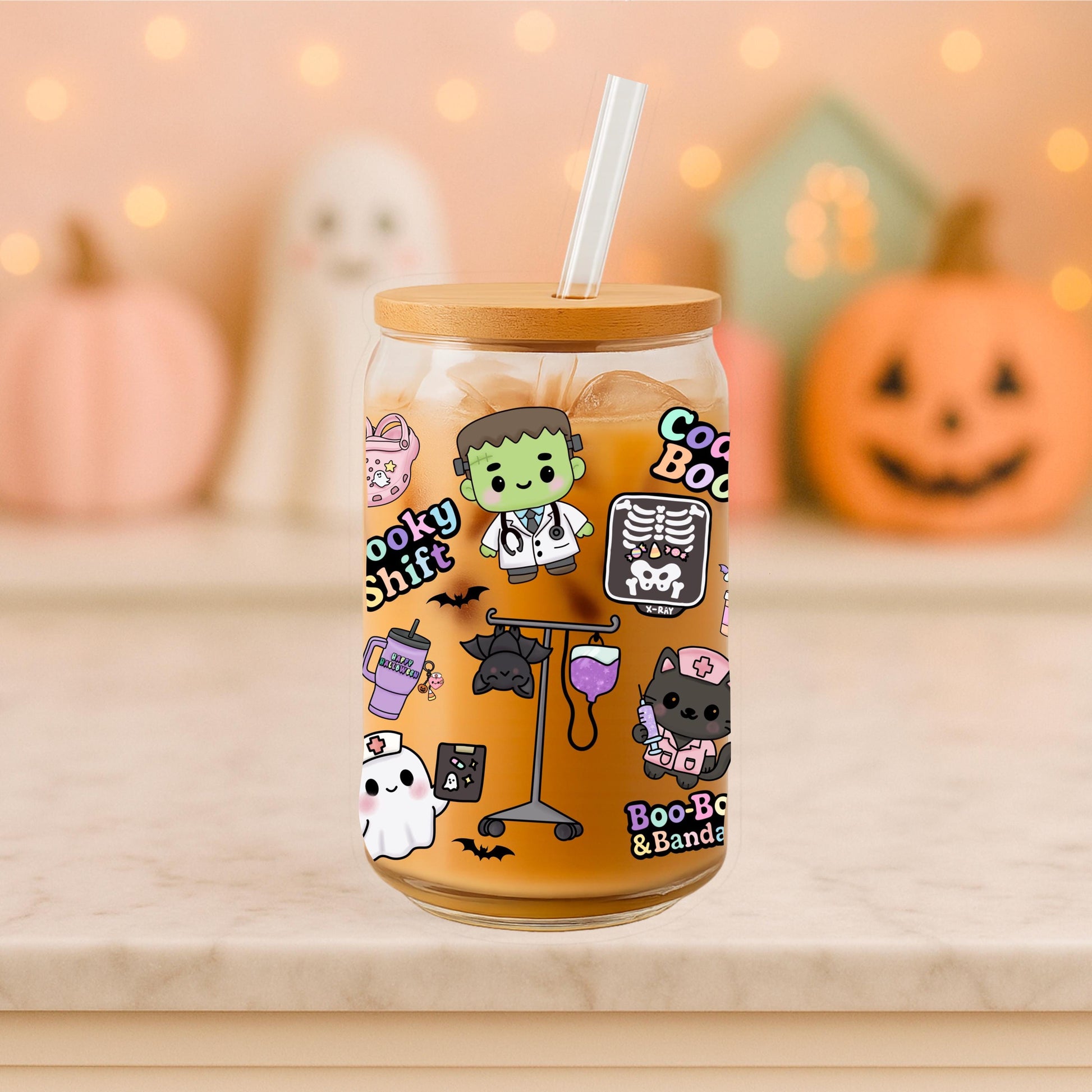 Dress up your drinkware this spooky season with the cutest Pastel Halloween Nurse glass wrap! Featuring black cats in scrubs, ghost nurses, Frankenstein doctors, candy-filled X-rays, and kawaii nurse charms with a pastel Halloween twist. This design fits 16oz Libbey-style cans and similar tumblers.