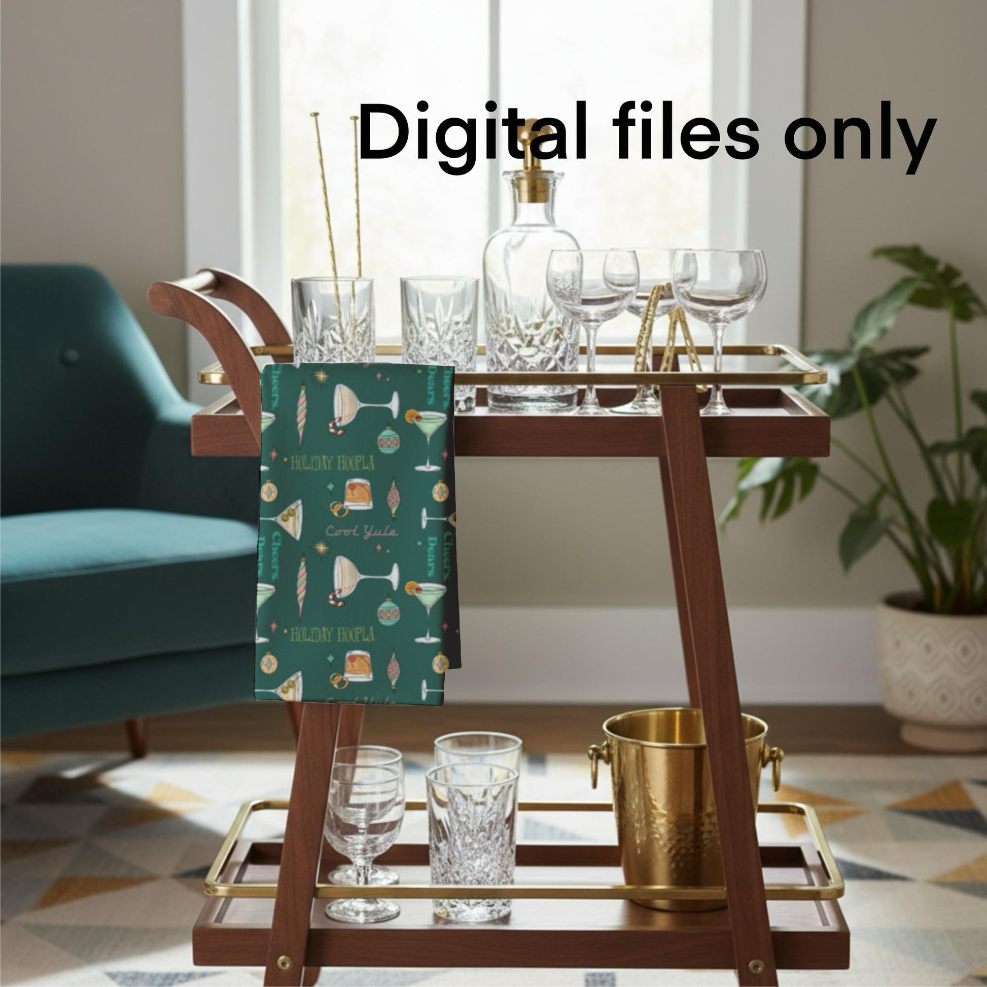 This seamless pattern is filled with mid-century martinis, vintage ornaments, starbursts, and playful retro lettering — perfect for the Palm Springs cocktail Christmas aesthetic.