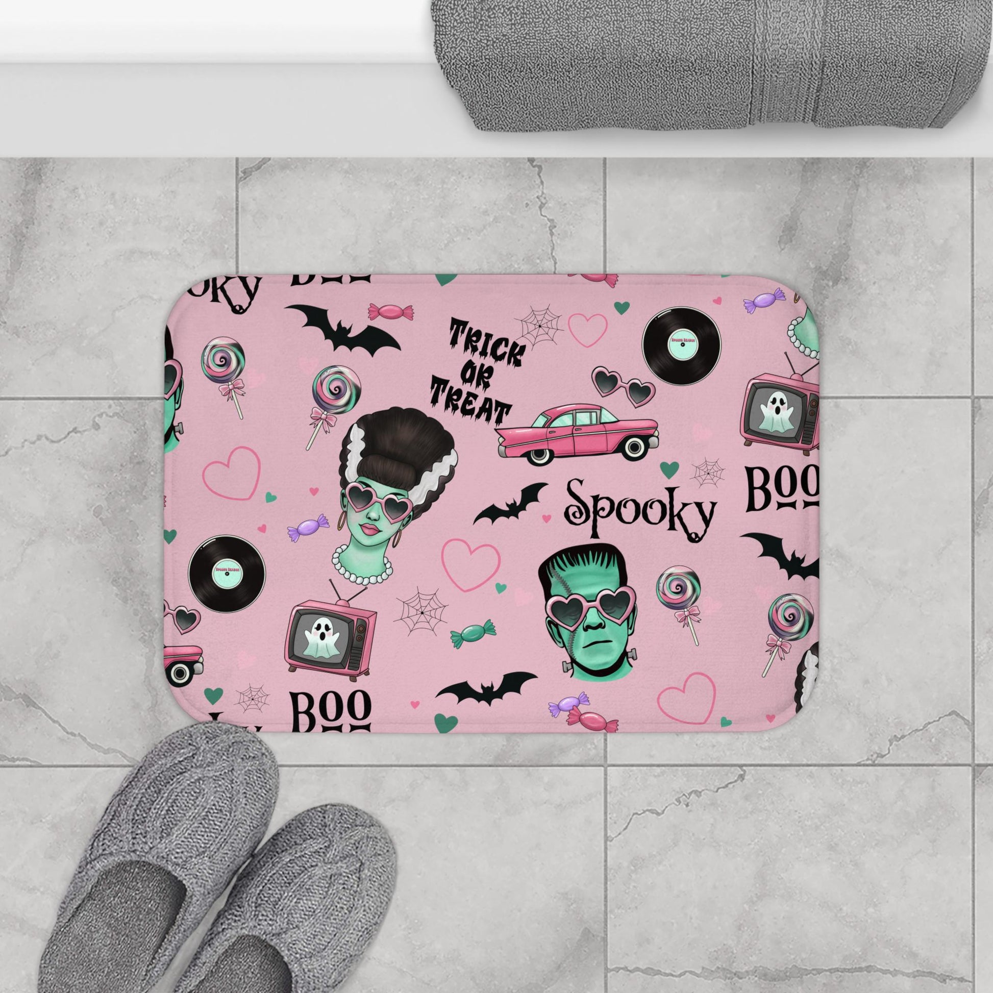 Retro Frankenstein Bath Mat: Pink Halloween Rockabilly Bathroom Decor