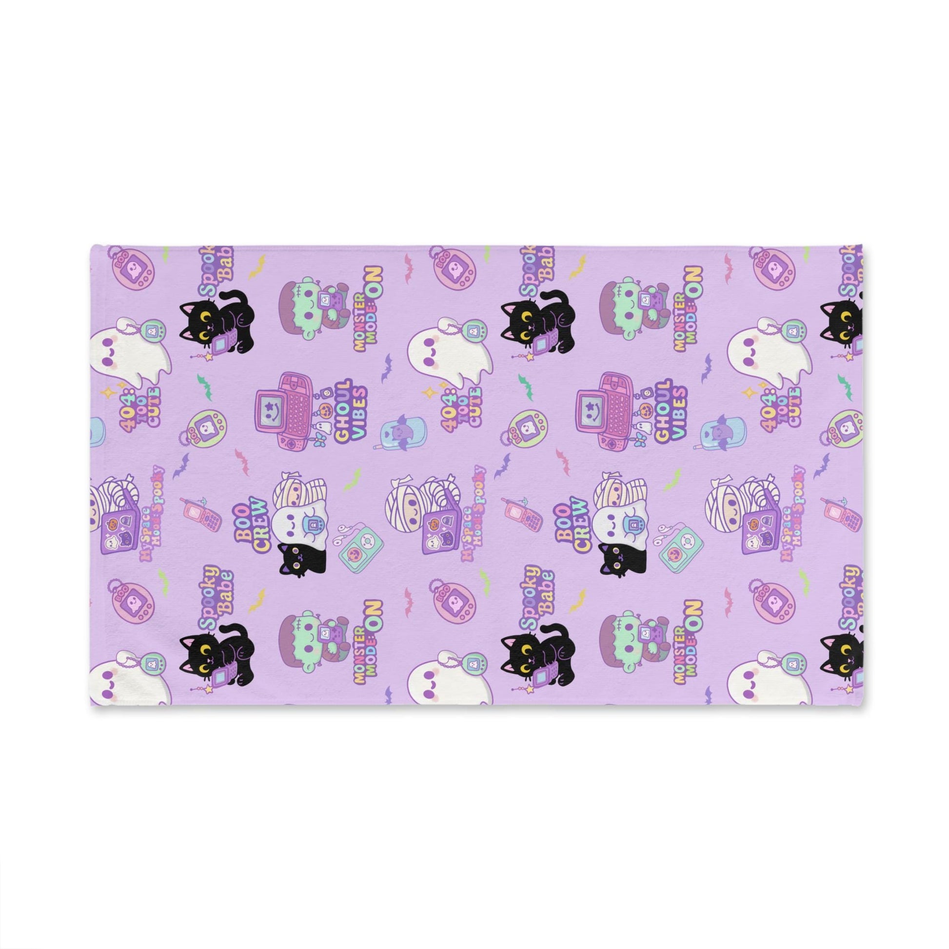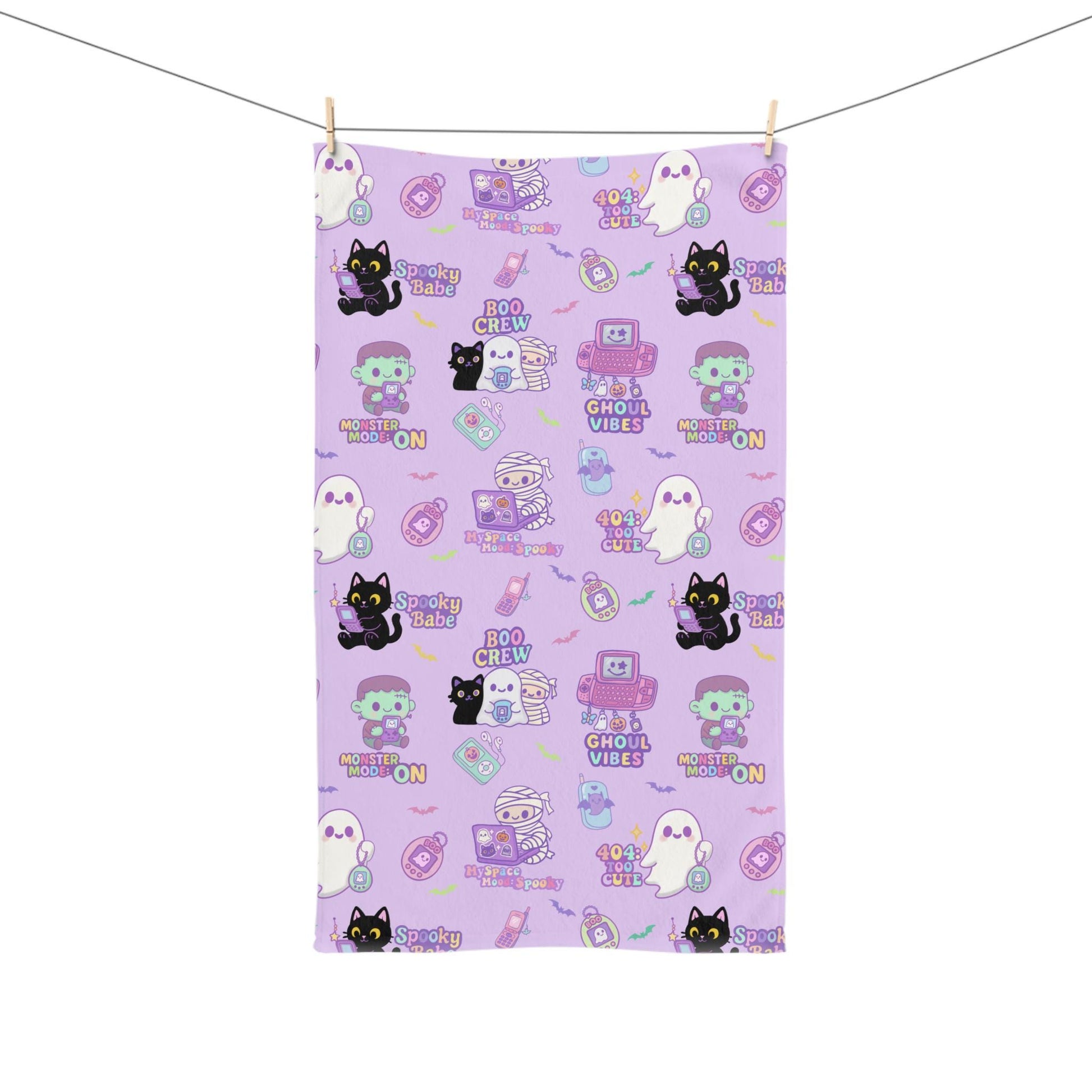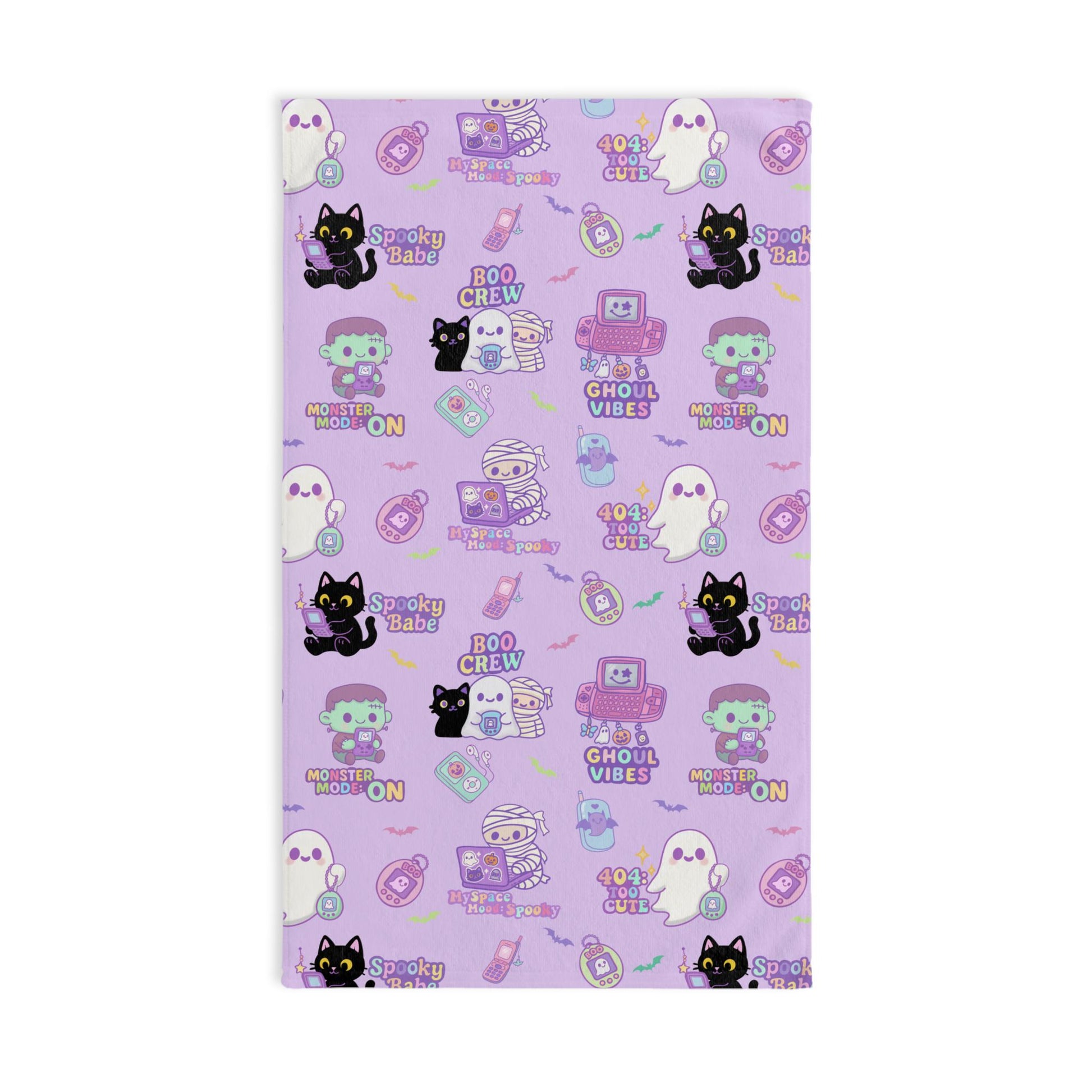 This Hand Towel features a cute retro technology y2k pastel Halloween print with tamagotchi, sidekick phones, gameboy, and Frankenstein kawaii Halloween characters. The soft and absorbent material makes it perfect for adding a pop of color and nostalgia to your bathroom or kitchen. Ideal for those who love y2k aesthetics and Halloween.
