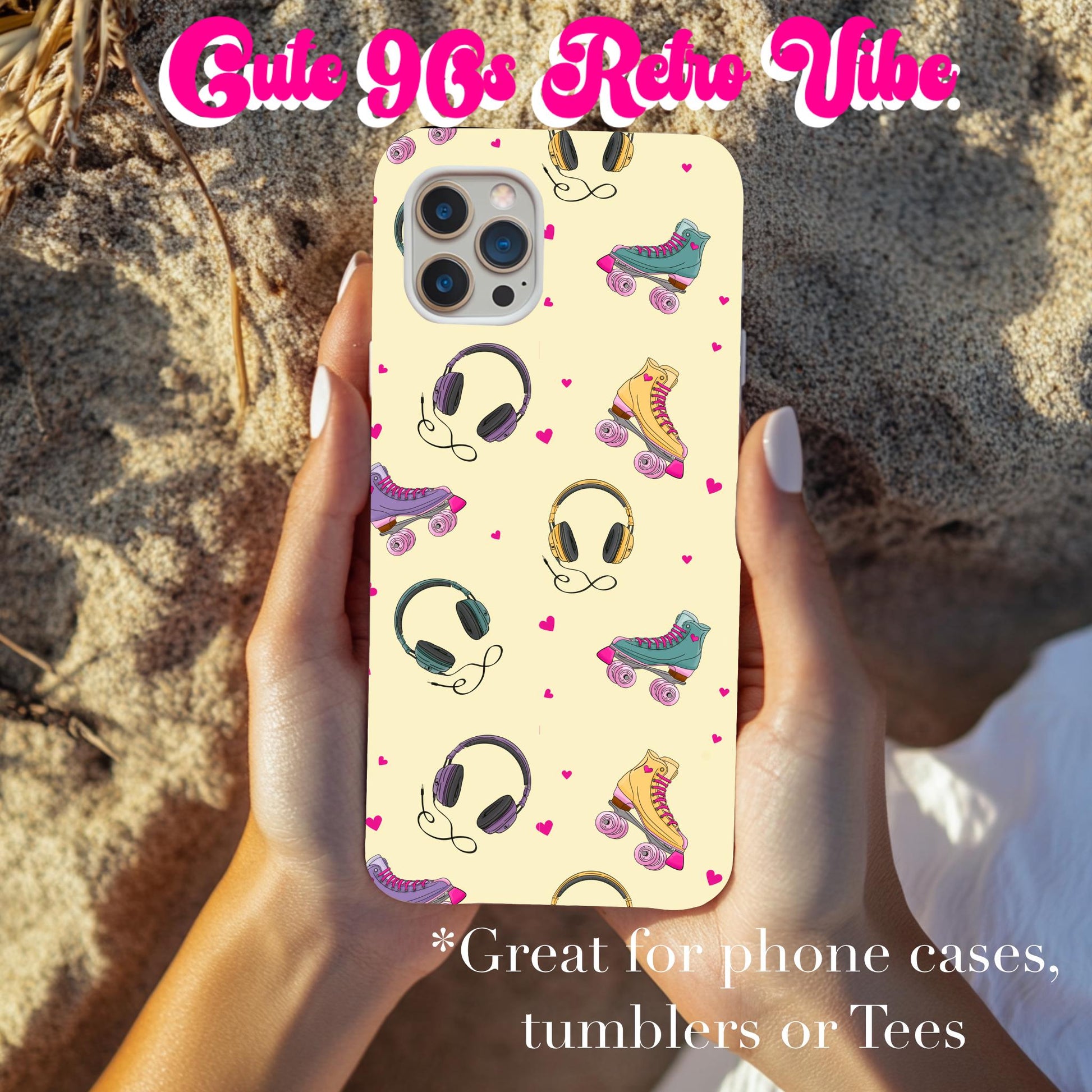 Bring all the fun retro vibes to your creations with this adorable roller skate and headphone seamless pattern! Featuring colorful roller skates, vintage-style headphones, and sweet pink hearts on a four background color choices, this high-energy design is perfect for anyone who loves music, skating, and playful retro style.
