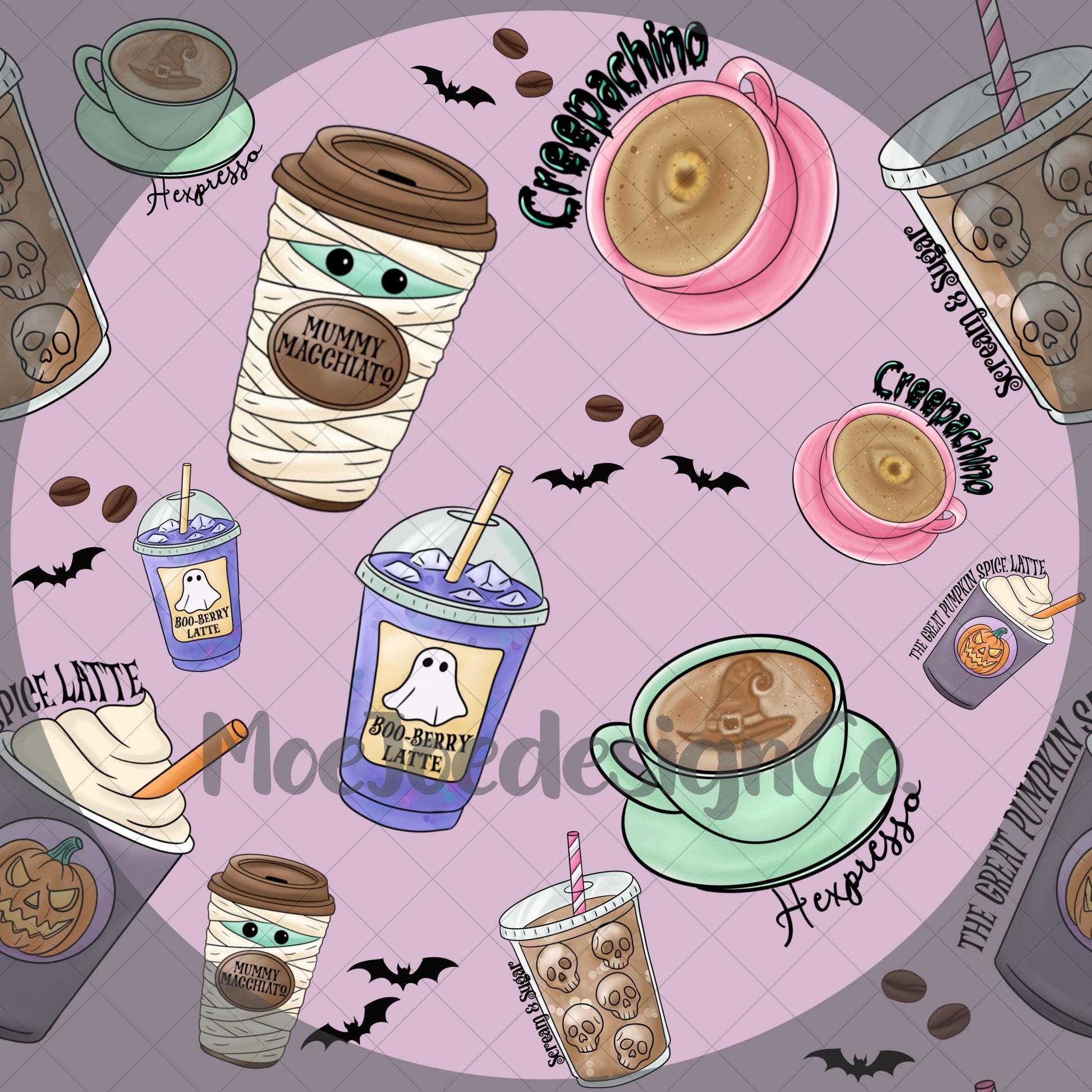 • Seamless edge-to-edge design featuring Halloween coffee characters only