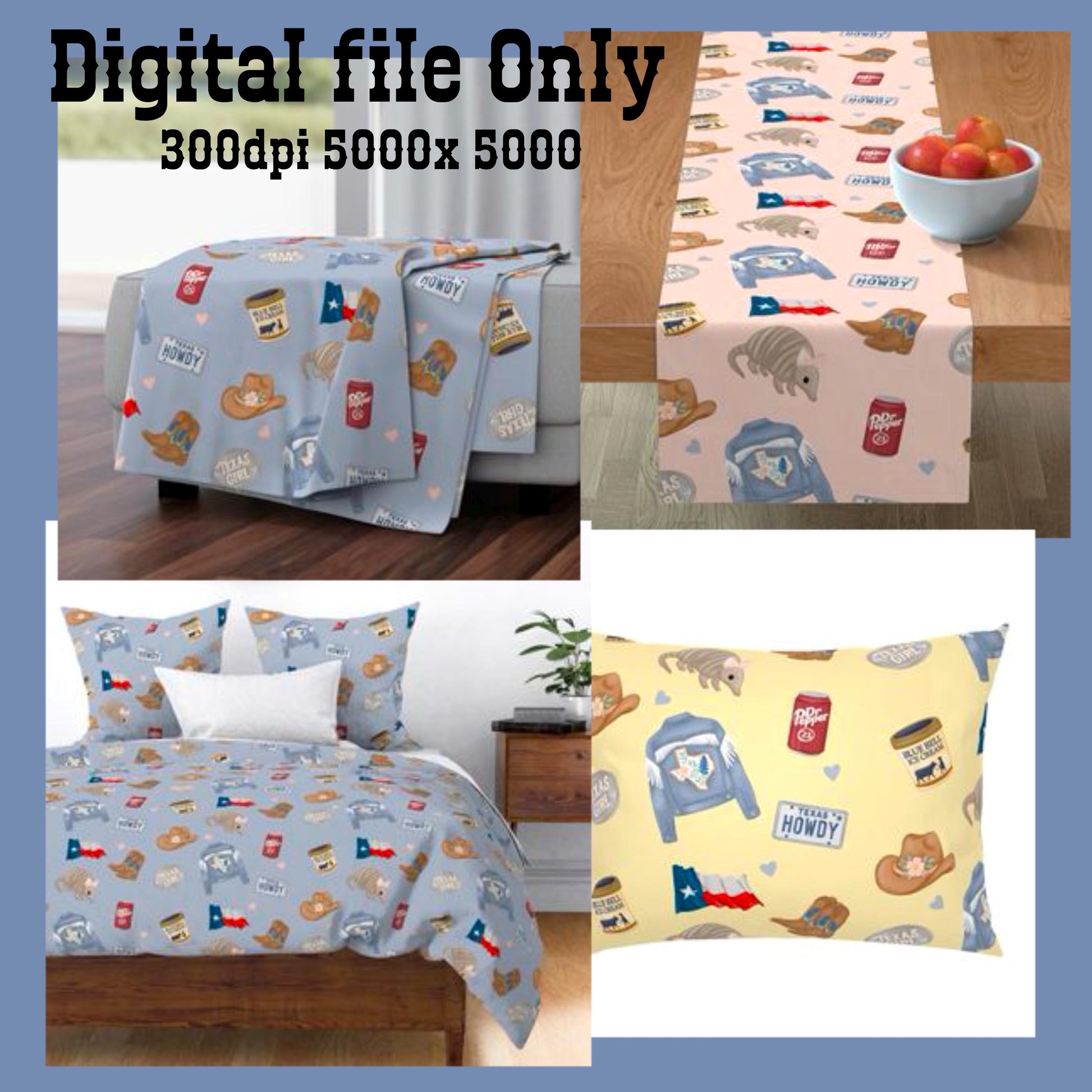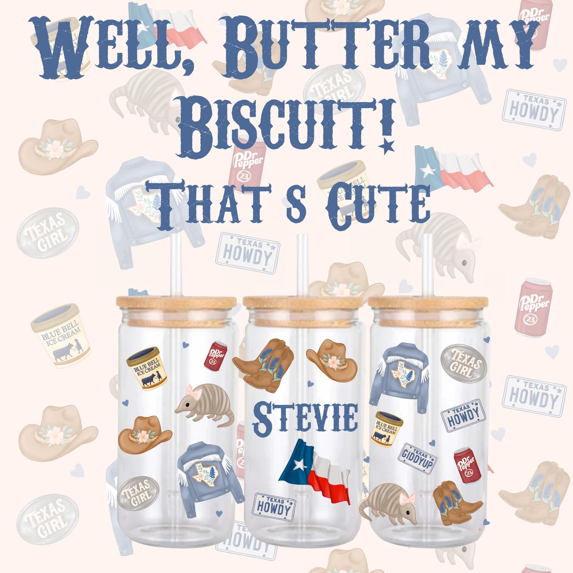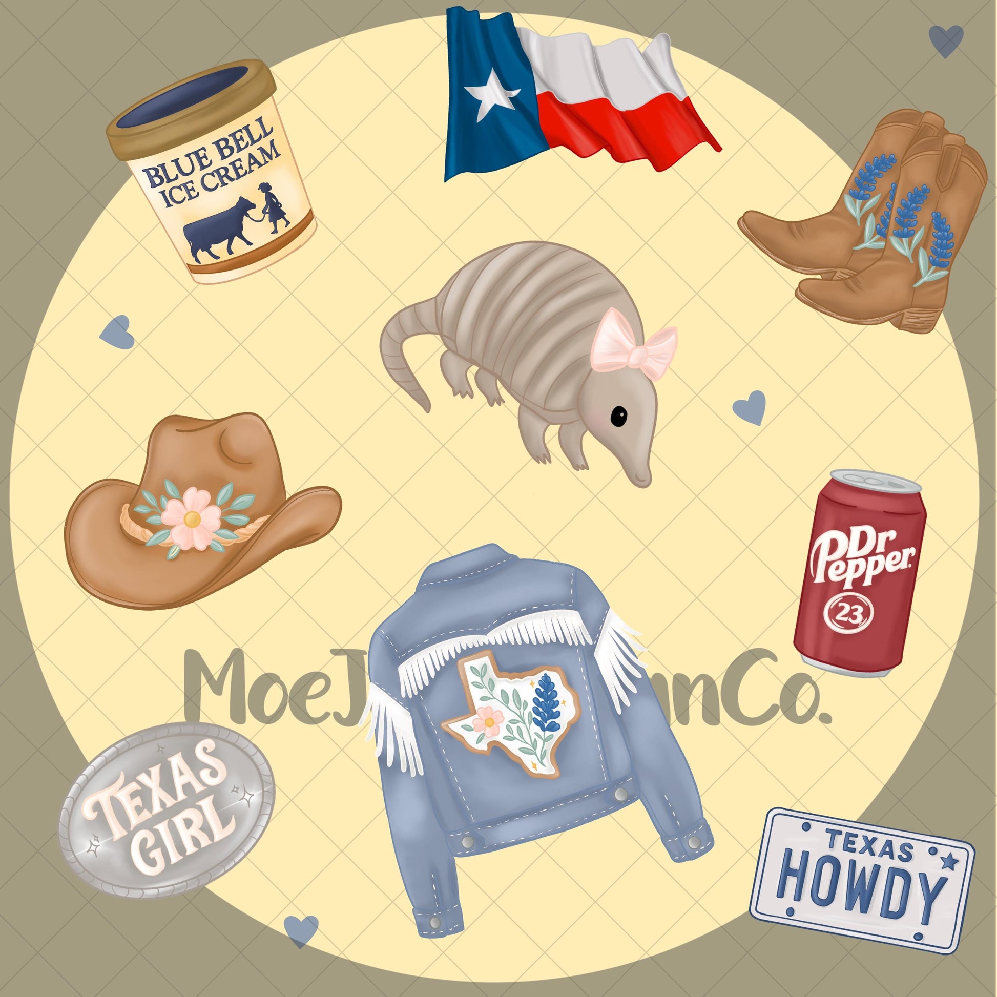Add some southern sass and charm to your next design project with this Texas Girl seamless pattern! Featuring hand-drawn MoeJoe-style icons like a denim fringe jacket with bluebonnets, armadillos with bows, Ice Cream, Sweet drinks, cowgirl boots, “Howdy” license plates, and more — this file is perfect for sublimation, scrapbooking, tumbler wraps, seamless fabric, or digital backgrounds. Yeehaw!