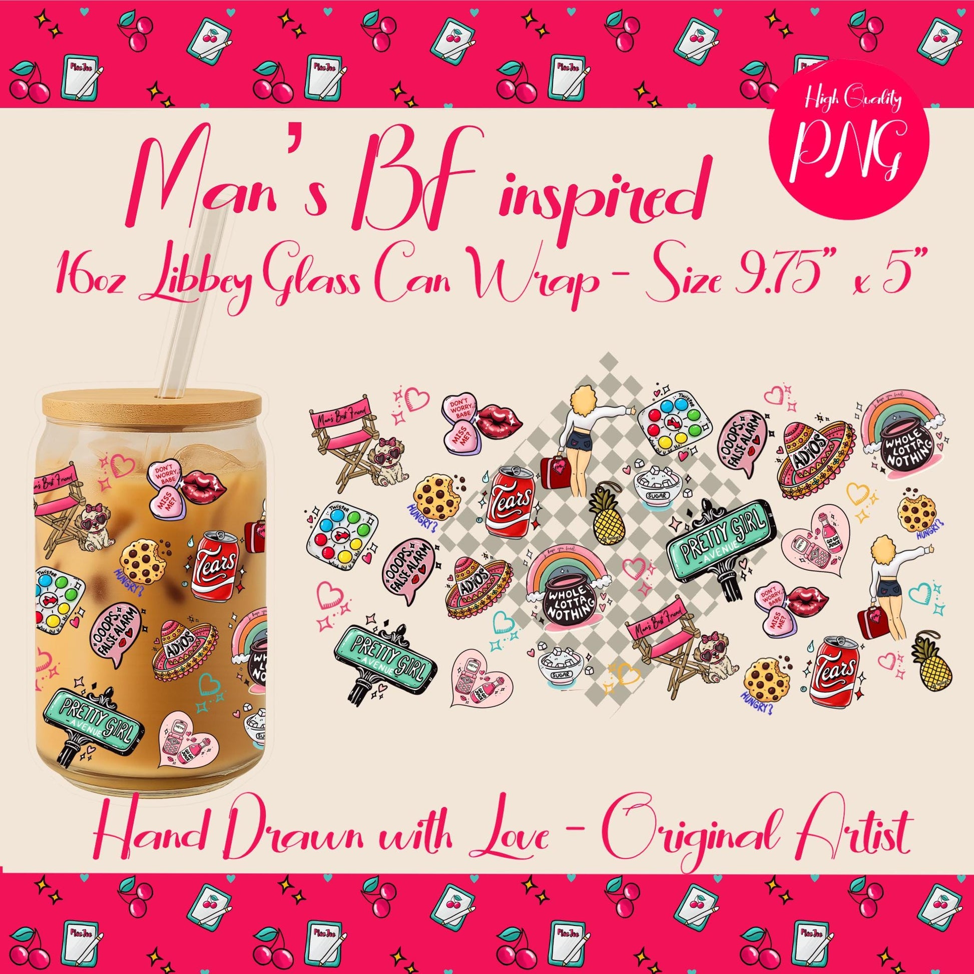 Add a playful pop to your Libbey glass cans with this hand-drawn seamless wrap! Featuring original, girly illustrations and a fun, light-hearted vibe, this digital PNG is perfect for making custom 16oz glass can tumblers stand out. Designed for easy application and crisp results, it’s ideal for DIY gifts, small business products, or just treating yourself!