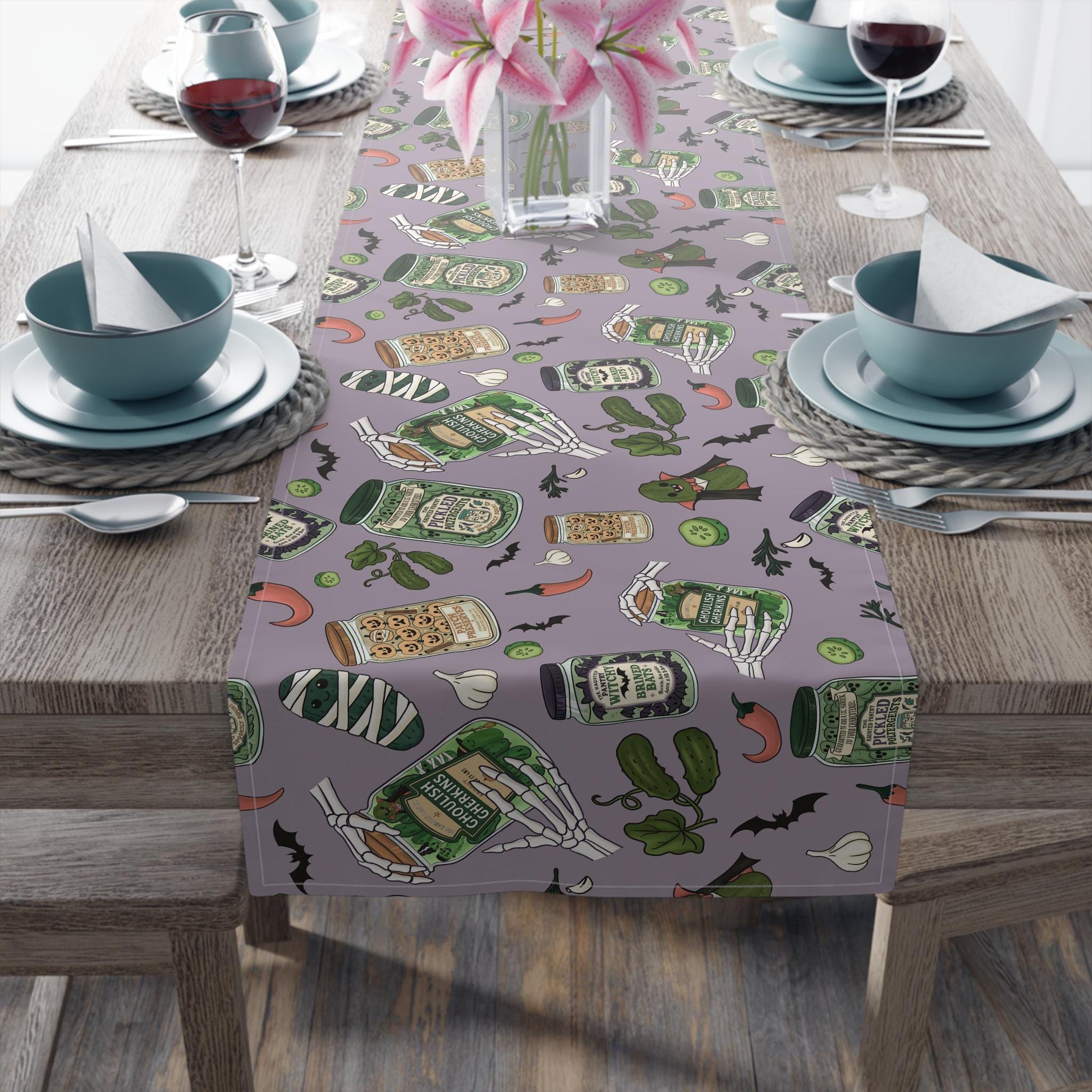 Adorned with quirky jars, haunted spices, and ghostly pickled goods, this one-of-a-kind table runner turns any meal into a magical experience. Whether you’re setting the table for a cozy fall breakfast, a haunted Halloween dinner party, or just want a festive pop of personality in your kitchen or dining space—this runner is the perfect centerpiece.