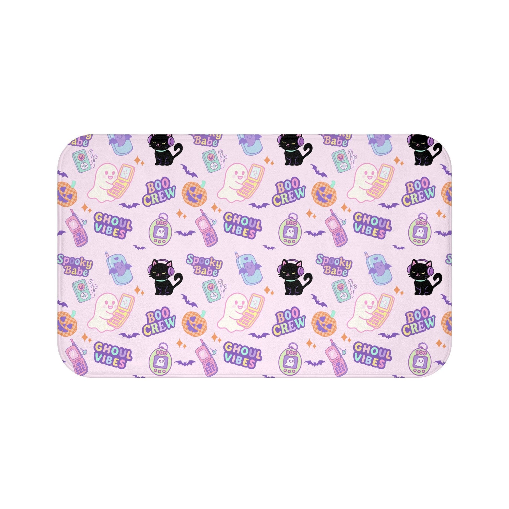 Get nostalgic with this pastel Y2K retro tech bath mat featuring iconic 2000s tech like sidekick phones and tamagotchi pets. Perfect for adding a cute and quirky touch to your bathroom decor. Ideal for fans of retro technology and Halloween enthusiasts.